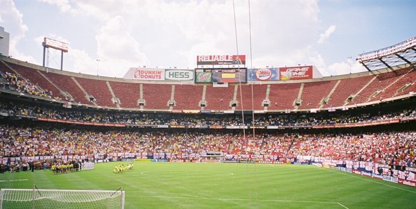 The Giants Stadium – home to the New York Giants – had turned to the dark side and was hosting a football match of the round balled kind. $150,000 had been spent on replacing the astro turf pitch with a grass surface specifically for this game. Actually it was two games as New York Metro Stars would face Chicago Fire in the MLS straight after the main event. Two for the price of one, I’m all over that!