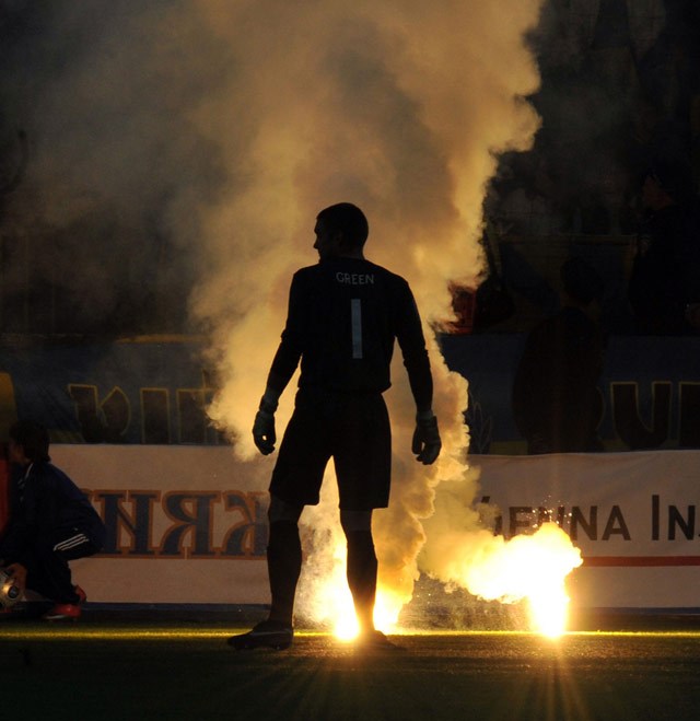 Robert Green seemed to be the chosen target in this instance and a number of flares landed around his feet. At one point the referee threatened to abandon the game if the ultras threw any more flares on to the pitch after a second hold up in play in the first half. The game was barely 10 minutes old!