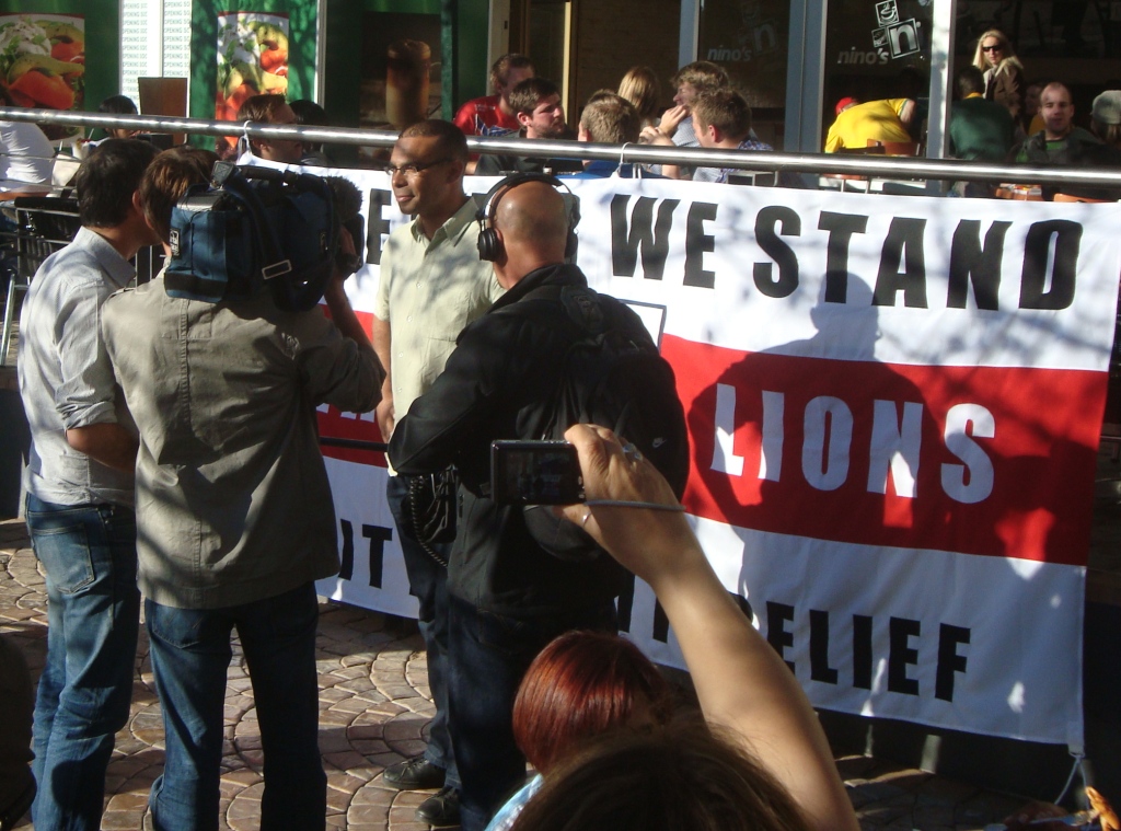 The day before the game was a much needed recovery day, and with the sun shining we spent most of it relaxing at the Loch Logan waterfront area in the city centre. There were a few England fans starting to arrive throughout the day and the English media were beginning to turn up as well. A few interviews conducted with our flag providing the backdrop!