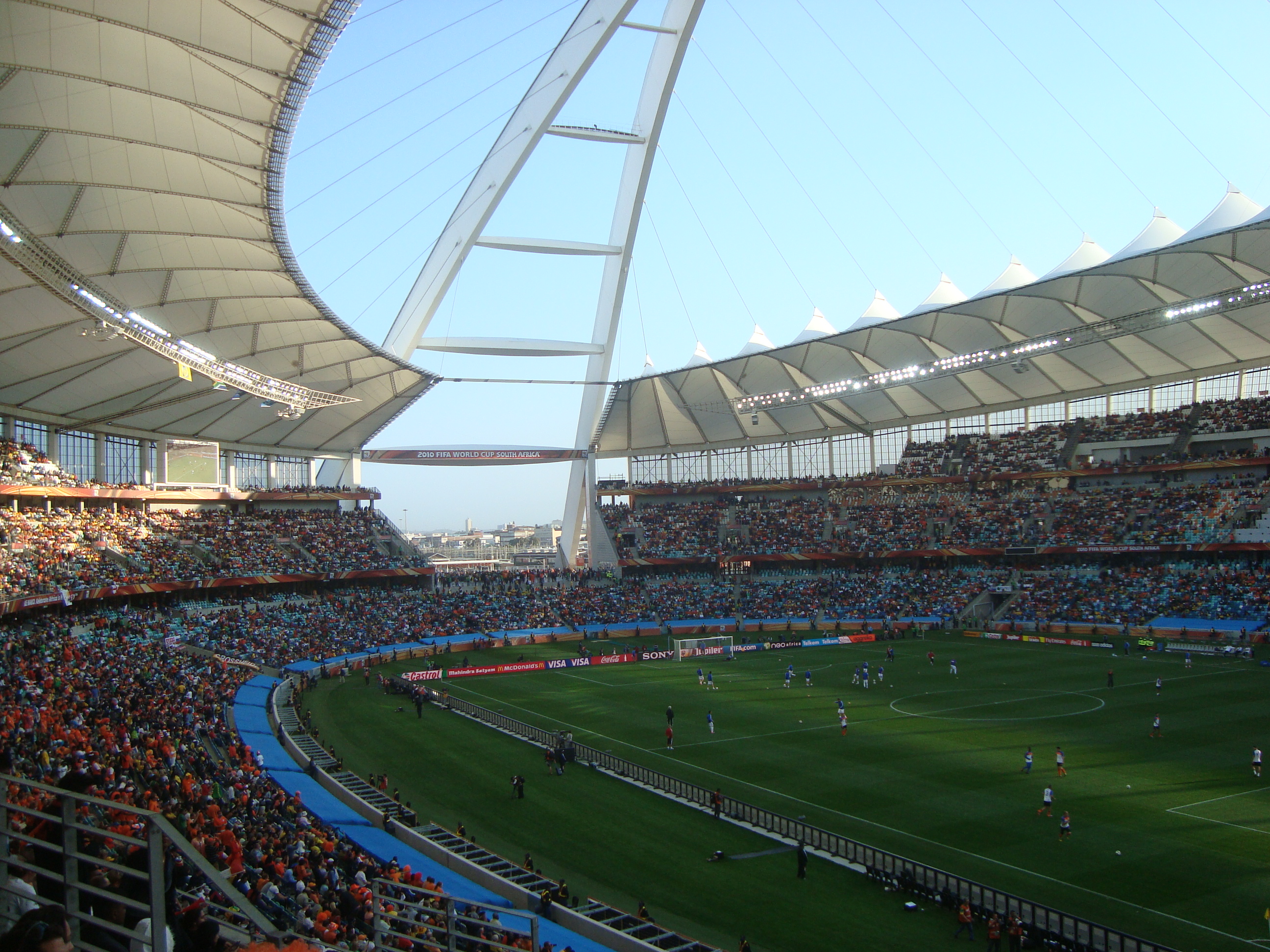 The Moses Mahbida Stadium is an impressive newly built stadium located in the Stamford Hill suburb of the city which is very close to the beach. Reminiscent of Wembley, the stadium has a huge arch supporting the roof of the stadium. Apparently the top of the arch is 106 metres above the pitch, and represents the once divided nation coming together.