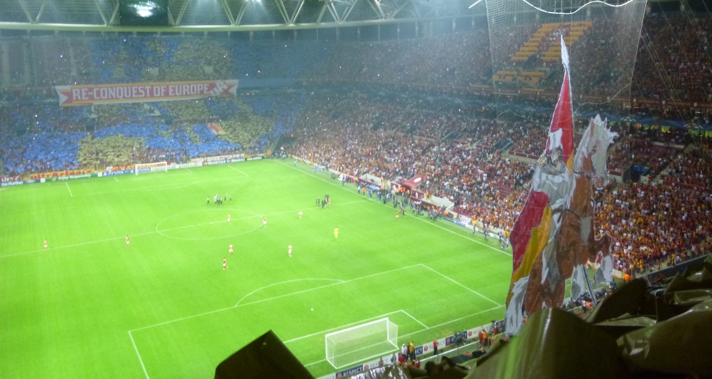 After a couple of hours of being pushed from one seat and poked to the next the main event started, the ultras showed up. Both ends had cards to hold aloft, a giant banner of a knight on horseback was winched in front of us as we promised the (conveniently in English) ‘Re-conquest of Europe’. It was incredible, but the displays and ear-splitting noise also seemed a little out of place. Normally when good old-fashioned teams move to swankier climes they leave the atmosphere with them. The verocifous old school Galatasaray fans in their glimmering megadome felt like seeing your grandma with an iPad.