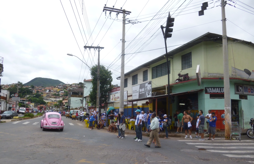 Villa Nova most recently played in the Brazilian fourth tier, but having nearly gone to the wall a couple of years ago, their season now revolves around just the state championship. So it is that for one night the state’s eyes are on it and Nova Lima felt like an underdog town on FA Cup third round day. Wide smiles adorned proud local faces, flags and banners were slung from windows and on one of the hills near the ground people were already perched two hours before kick off for an illicit match view. To complete the feeling the streets around ran with out of town Cruzeiro fans. Conspicuous as much by their big city attitudes as by their blue shirts.