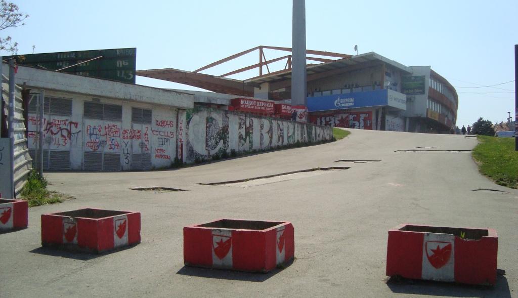 Partizan and Red Star’s stadiums are located within about 400m of each other, so as derbies and club locations go this is one of the closest. We had started the day off by walking from the city centre out to the stadiums to have a quick look around before it got too lively later on. The Marakana – home of Red Star Belgrade – is named after the Maracana in Rio because of its initial 110,000 capacity back in the 60’s. These days it holds 55,000, and for me is the more aesthetic of the two grounds. Despite needing a lick of paint on the exterior, the interior of the ground is impressive. There is a small entrance into the stadium for the club shop off ‘Ljutice Bogdana’ Street and this allows you to walk in and get good views out across the stadium and the playing surface below.