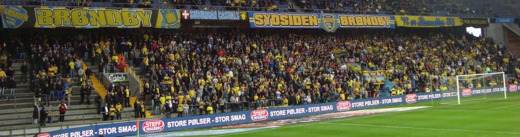 The clubs ultras are located at the only non-seated section of the stadium. This stand used to be nick-named “Faxe” after the previous beer sponsor of the stand. That nickname is also shared by one of the club legends John “Faxe” Jensen, who played for the club before and after his 97 game spell for Arsenal in the mid 90’s. After the club changed the beer-provider from Faxe to Carlsberg, the name of the stand was changed to Sydsiden (South-side).