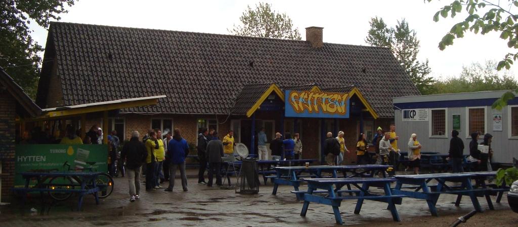 If you approach the stadium from Brøndbyoster station you will eventually turn right on to a road called ‘Park Alle’ and after crossing the motorway turn left onto a small road called ‘Gammell Kirkevej’. Down this road (or side street) and as you approach the ground, you will notice a small bar on the left called the “Hytten” (meaning ‘cottage’ or ‘shelter’).