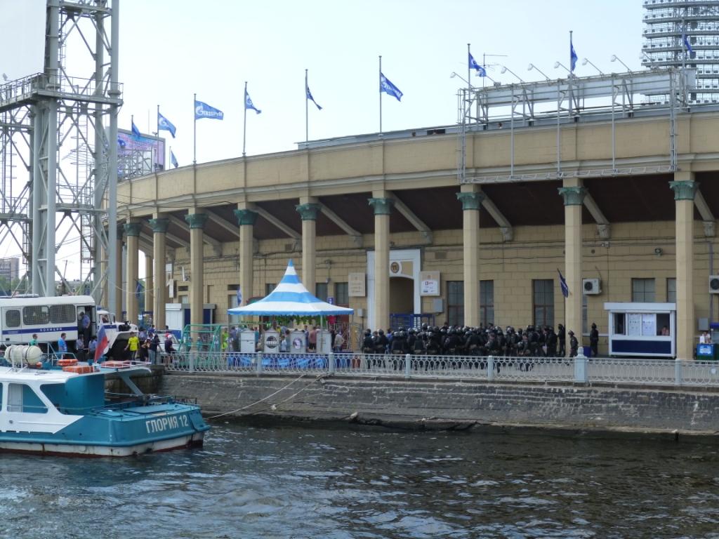 Flanked on all sides by rivers and canals, Saint Petersburg is a breathtakingly beautiful city, and the Petrovsky Stadium is certainly not out of place, sitting on a small island all to itself beside one of the estuaries. However, walking over the bridge from the centre of the city it was not the picturesque setting that controlled my eye line, but the police, the rows and rows of police.