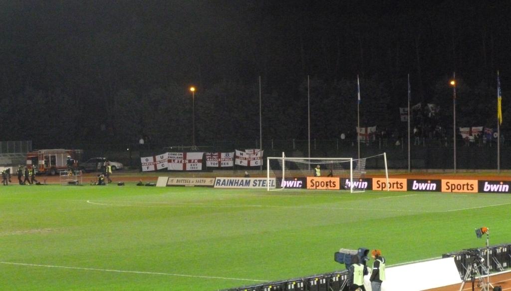 The ground is a two sided athletics stadium with a capacity of 7,000. Mark had likened the ground to watching an international at Willesden athletics track and he wasn’t far off the mark. Behind both goals were fenced off, one with a hill rising up behind one end, and a smaller area of shrubbery at the other. Both would provide perfect viewing platforms for ticket-less England fans that had travelled – and if we ever draw San Marino again and you don’t make the cut from the ballot – do not fear – go anyway the view was probably better from the hillside than in the ground!