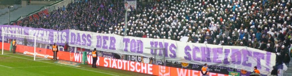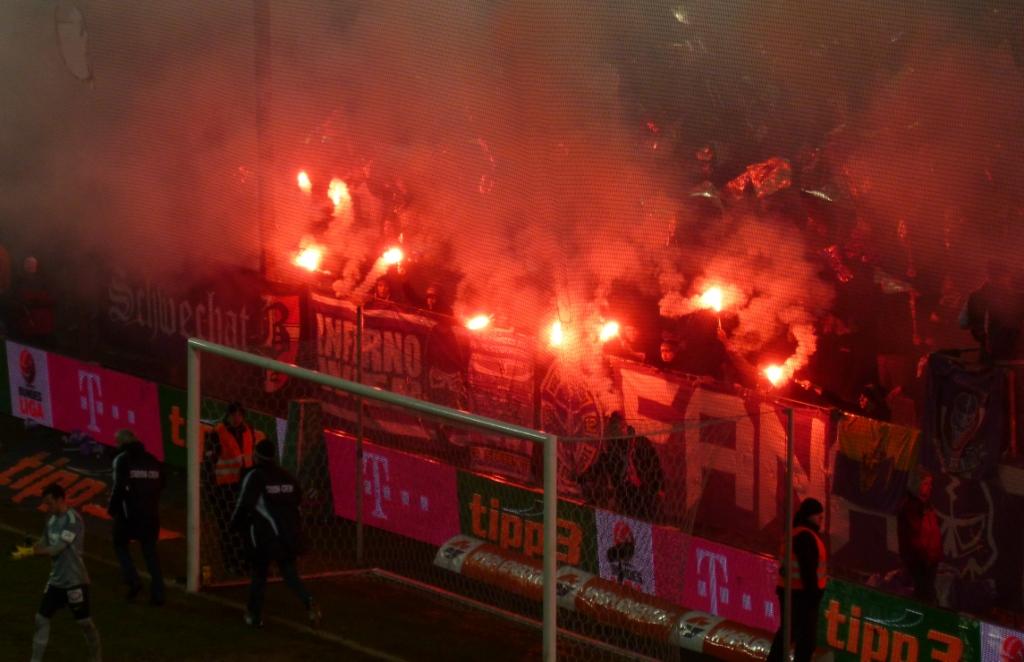 Austria Vienna’s main ultras group are known as the ‘Fanatics’ and their banner took centre stage in the Osttribune. What was also immediately noticeable, but slightly unusual, was that the Fanatics had carefully split themselves up into two distinct sections, one set of fans wearing purple beanie hats, and the other wearing white ones! Maybe this was a clue to their pending display, but either way I’ve never seen a set of football supporters choreographed by their choice of headgear!
