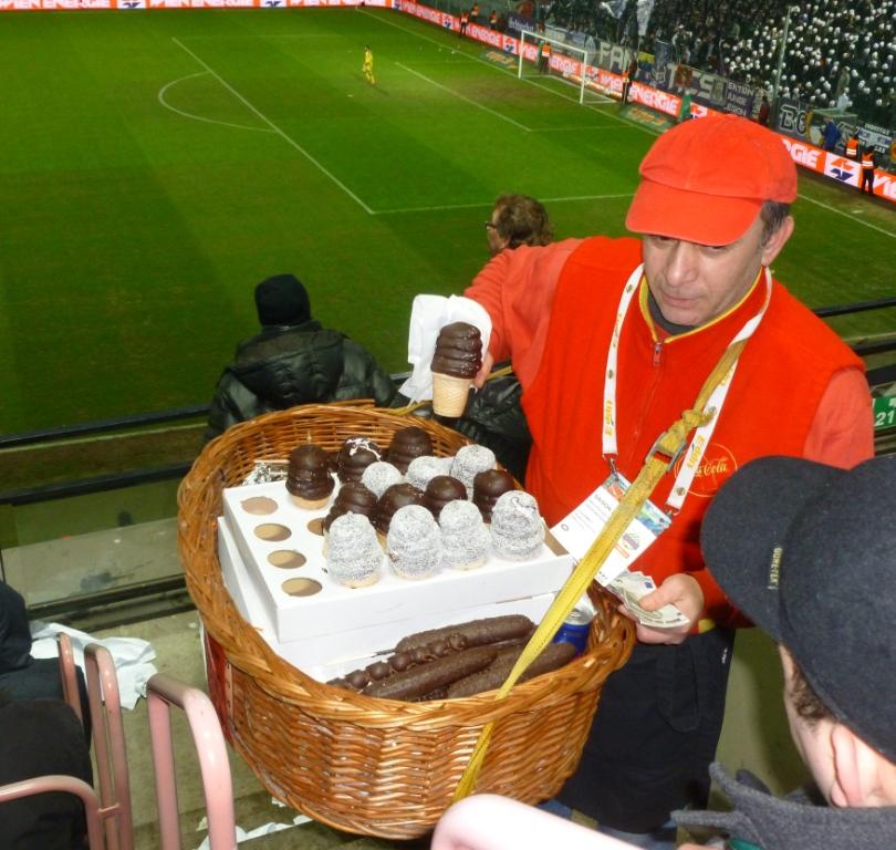 As soon as the Osttribune returned to some form of normality, my eye was momentarily turned once again by what appeared to be a man selling small loaves of bread from a large basket! As he neared our section of the stand it was actually giant sized pretzels that he was selling, and believe me, they were selling like hot cakes, sorry, like giant pretzels do here! As the pretzel man then moved onto another section, cue the arrival of the “beer girls!” Yes you read that right, the “beer girls!” You tend to get thirsty after a dry salty pretzel, so what better way to wash it down than with a cold beer brought right to your seat by one of the Rapid Vienna beer girls. The club appear to have got their refreshments marketing spot on. Happen to have a small child with you for the big game who isn’t quite into ‘it’ as much as you are? Do not fear! A man selling huge chocolate covered marshmallow cones will make your day. For 2 euros you won’t hear a peep from the kids for the rest of the match!