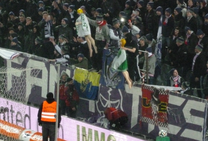 As the second half progressed Rapid began to take control of the game, and their dominance was only momentarily interrupted as the ‘Fanatic’s’ unveiled some blow-up dolls dressed in Rapid Vienna colours (see photo below). I won’t describe what became of those blow-up dolls, but it’s fair to say that it was more than derogatory and a provocative attempt to incite the Rapid fans.