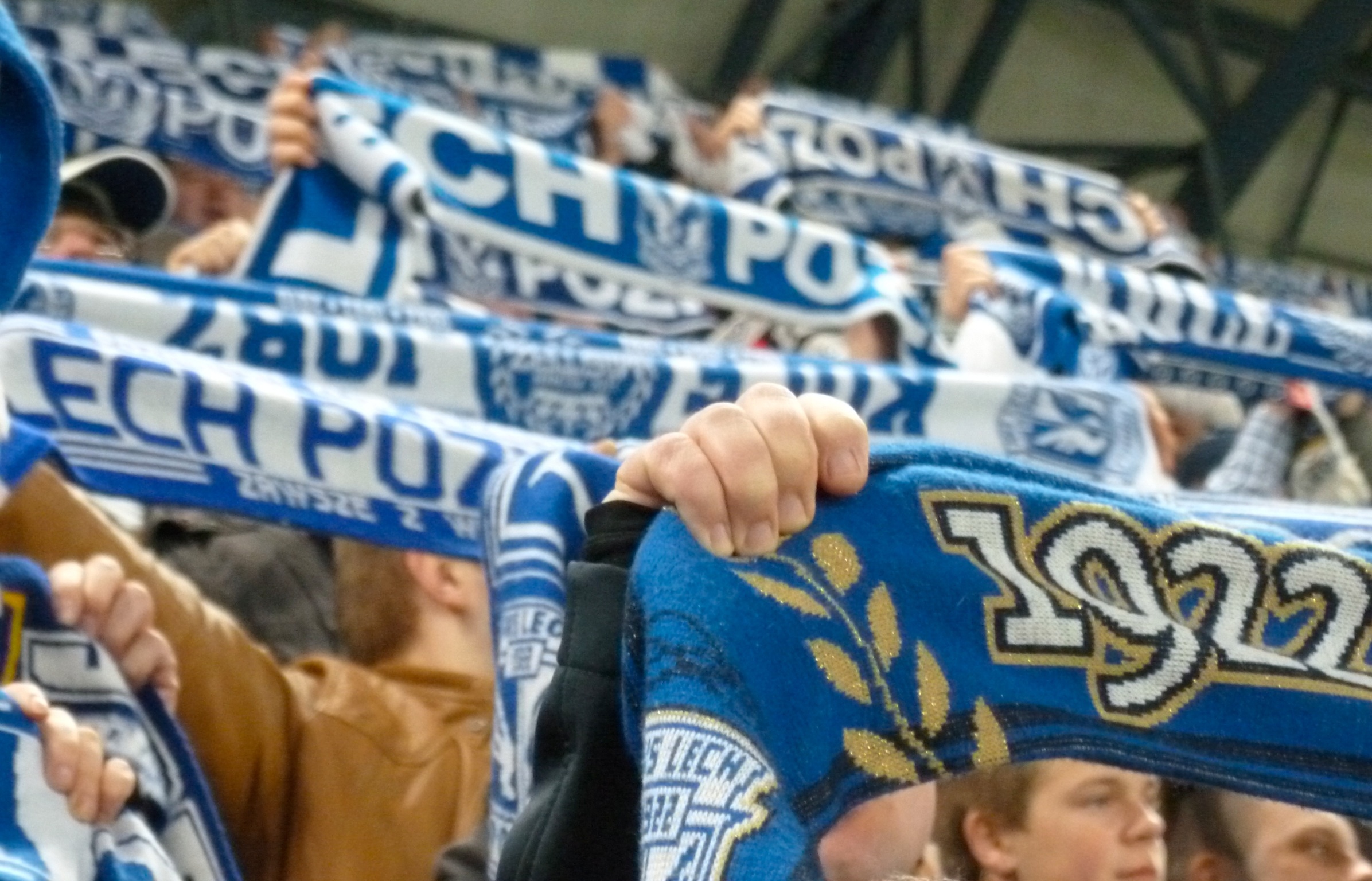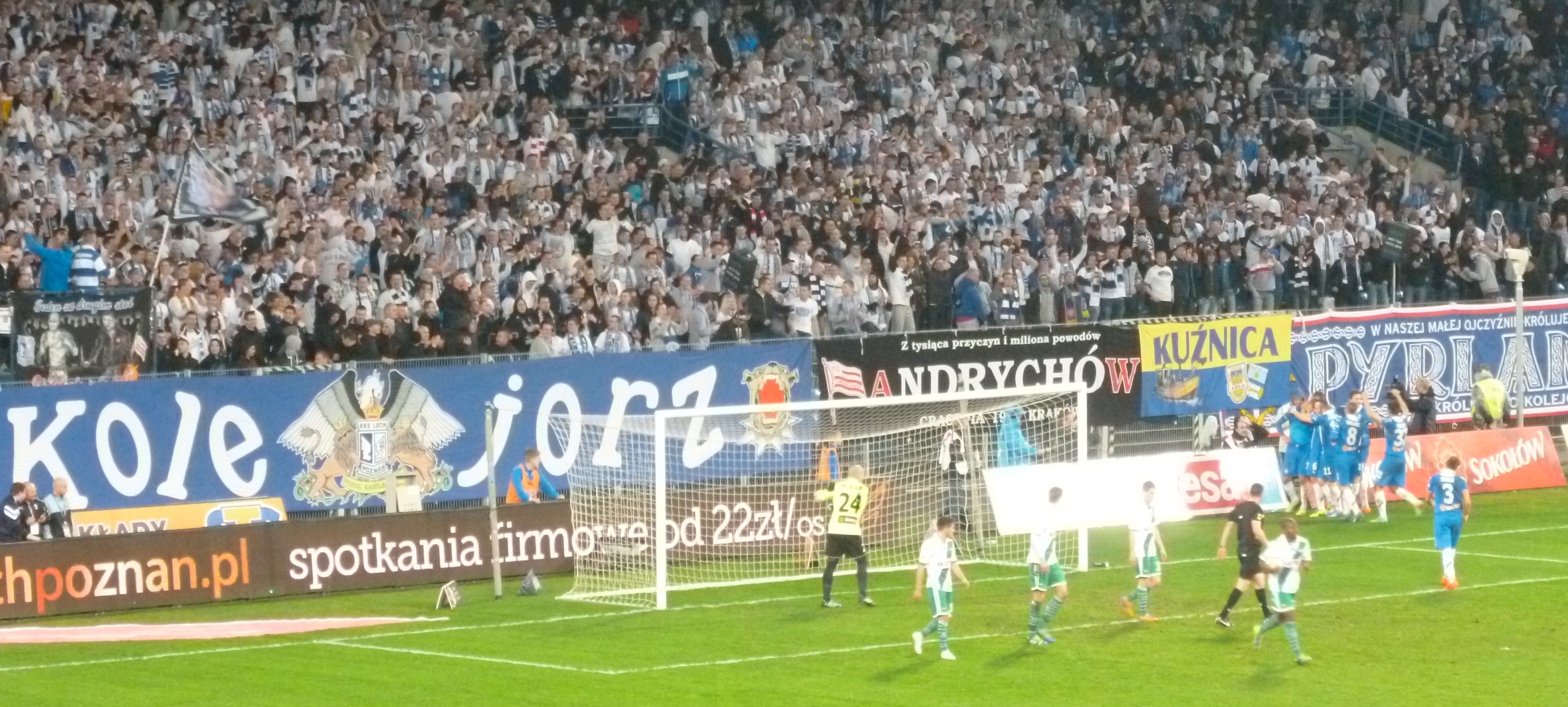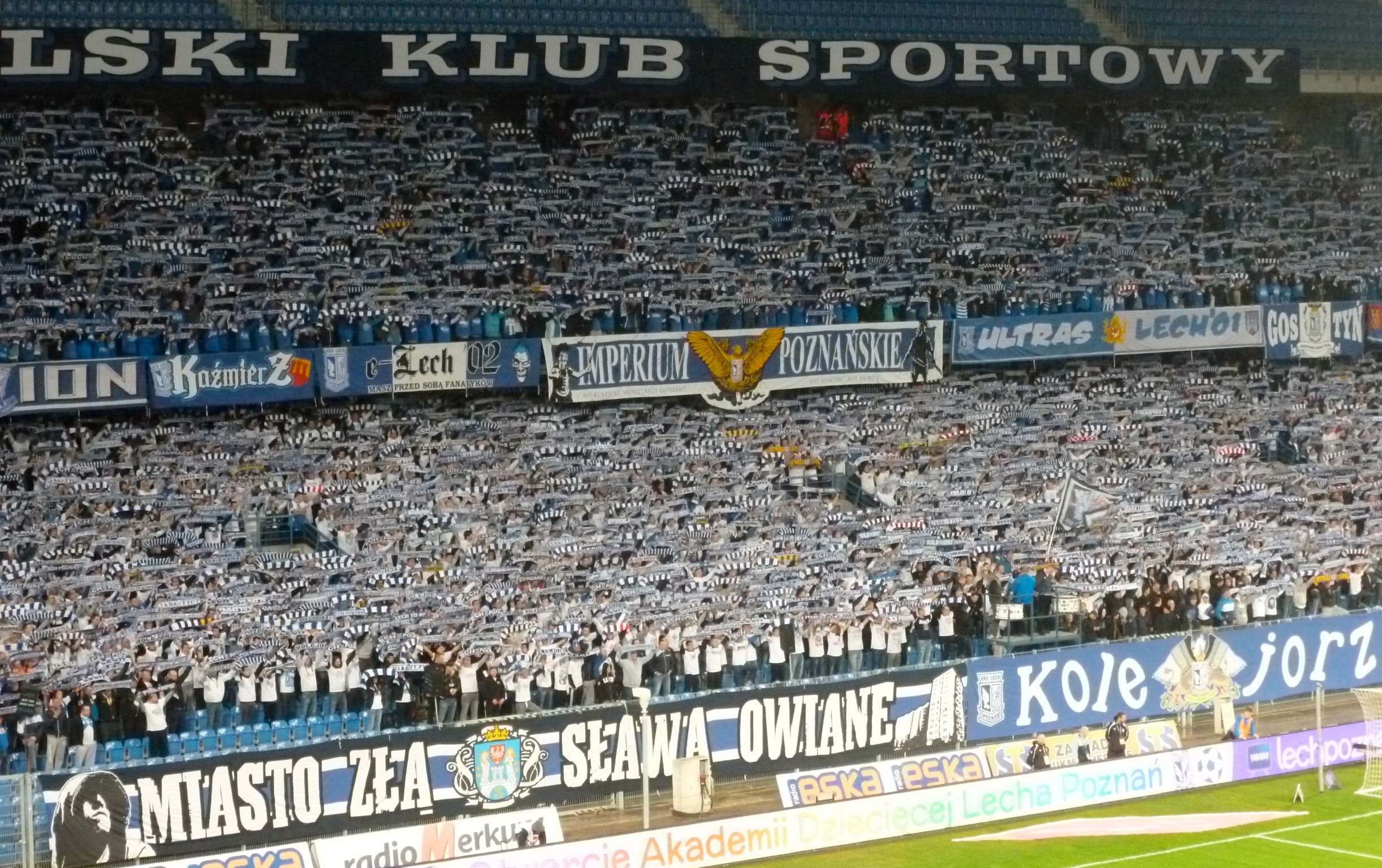 One of the main ultras group at Lech Poznan is called ‘Kole Jorz’ (which loosely translates as the ‘railwaymen’) and their banner takes centre stage behind the goal of Tribune I. Tribune I, a 3-tiered stand is an amazing sight. Carefully positioned banners along the length of each stand along with thousands of ultras co-ordinated by shirt colour looks impressive to say the least. Bottom tier you get in if you wear white, middle tier if you’re wearing blue.