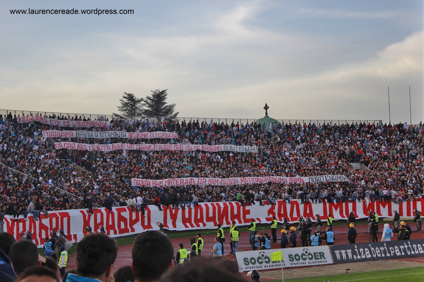 This fixture comes with a reputation for serious trouble and even with the amount of football I’ve watched over the years, I’ve seen nothing quite this intense. Even before taking the taxi out to FK Slavija that morning there were riot police in full body armour on the streets of Belgrade, and when I took the taxi out to the ground I kept a very low profile, to the extent that the external pictures were taken with my iPhone! The security check didn’t worry about my camera, of more concern were coins and cigarette lighters and I would imagine weapons and flares. I am indebted to ace blogger Stephen Carpenter of ‘The Chicken Balti Chronicles’ for securing tickets in the West Tribune, a “Safe” mixed section; it was clear that the Ultras at the ends would do their thing, while the mixed tribune was allowed slightly more relaxed policing.