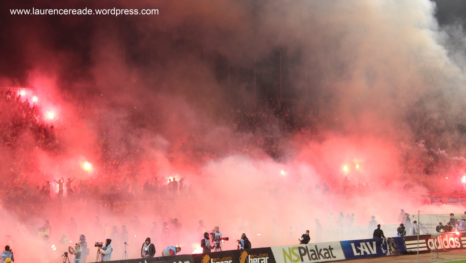 The win I suspect won’t stop Red Star taking the title, perhaps this was a case of Partizan winning the battle but not the footballing war. On the final whistle, the Red Star fans in my tribune quickly disappeared, and I soon followed them as the stadium erupted with noise and flares. It wasn’t difficult to get a taxi back to Slavija Square and as I alighted the riot police looked at me nervously. In truth I was glad of their presence.