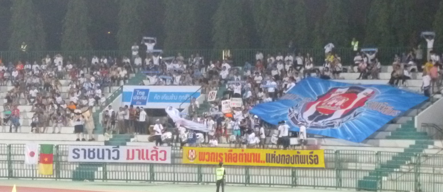 With a 20,000 capacity, the stadium has one seated main stand, and three sides of terracing or concrete seating all separated by that old fans favourite – an athletics track! The ground wouldn’t be out of place on the Eastern Bloc, and with the exception of the away fans and what appeared to be army personnel behind one end, the home fans took their place on either side. Tickets can be purchased from one of two locations – a ticket office on the ‘Thanon Vibhavadi Rangsit’ road side (outside the home terracing section), or on the opposite side of the ground outside the player’s entrance via two ladies sat at a table selling tickets. Terraced tickets are priced at 100-150 Baht (£2-3), but as it was Valentine’s Day I thought I’d splash out and treat the wife to a VIP seat at 200 Baht (£4)!