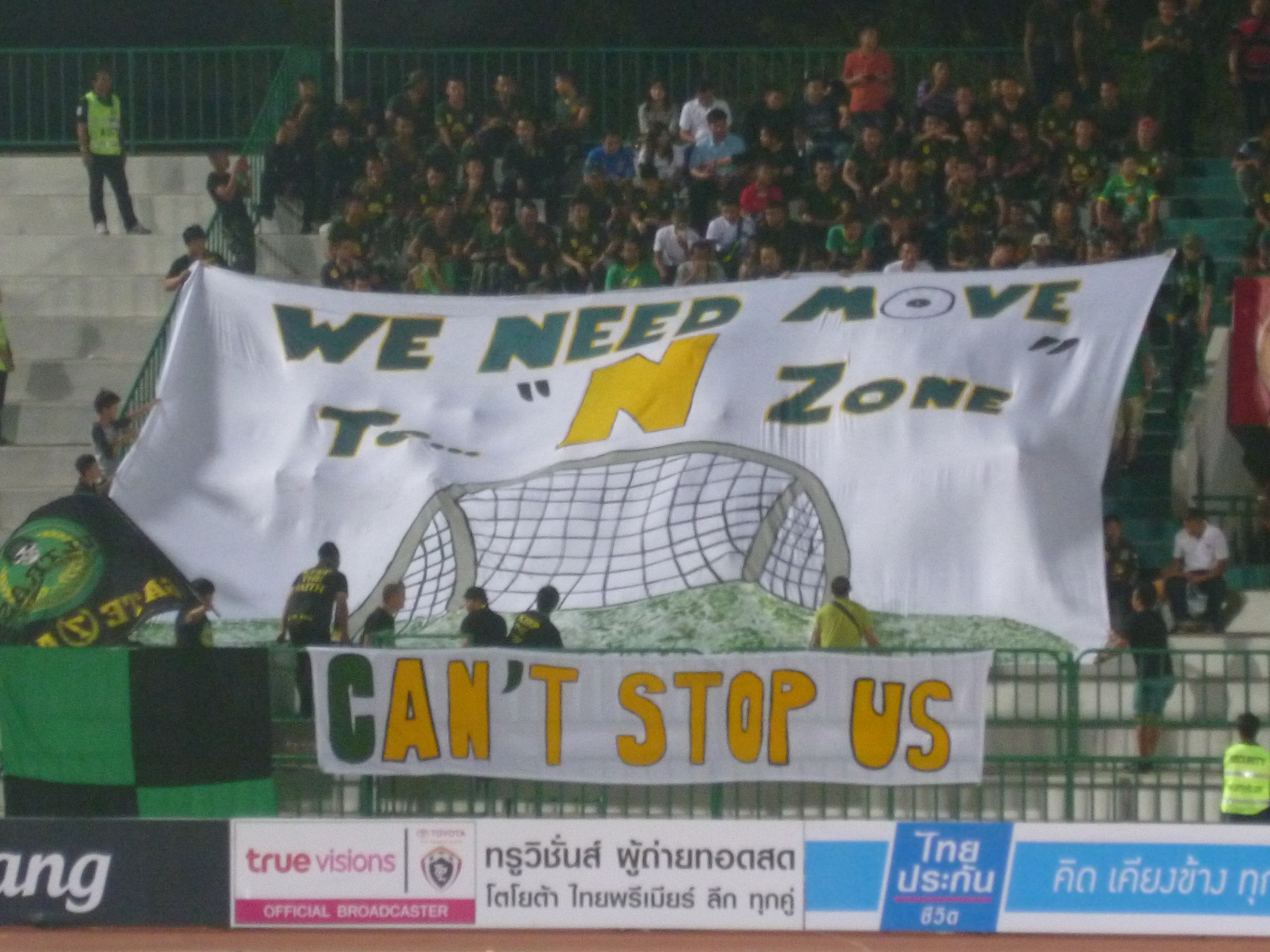 As you enter the ground, you get flashbacks to your old school disco as you receive an ink stamp on the back of your hand. With no catering options inside, and in certain parts of the ground no toilets either, the ink stamp becomes your passport in and out of the stadium both before and during the game! There are a number of small shops and bars on the perimeter of the stadium, and there is an area of marquees located outside the home terraced section which gives the feel of a fan park. There was a real relaxed and friendly vibe here and it made for a great place to have a pre match, half time and post-match drink! A large bottle of Chang costs 60 baht (£1.20) and you can come and go as much as you please during the 90 minutes too. At half time it was a bizarre sight as most of the stadium spilled out onto the streets outside and head for the refreshment tents. With 1 litre plastic beakers handed out there’s not only room for your large 640ml ice cold bottle of Chang, but also an extra 330ml can on top! No problems keeping hydrated in the heat of Bangkok here!