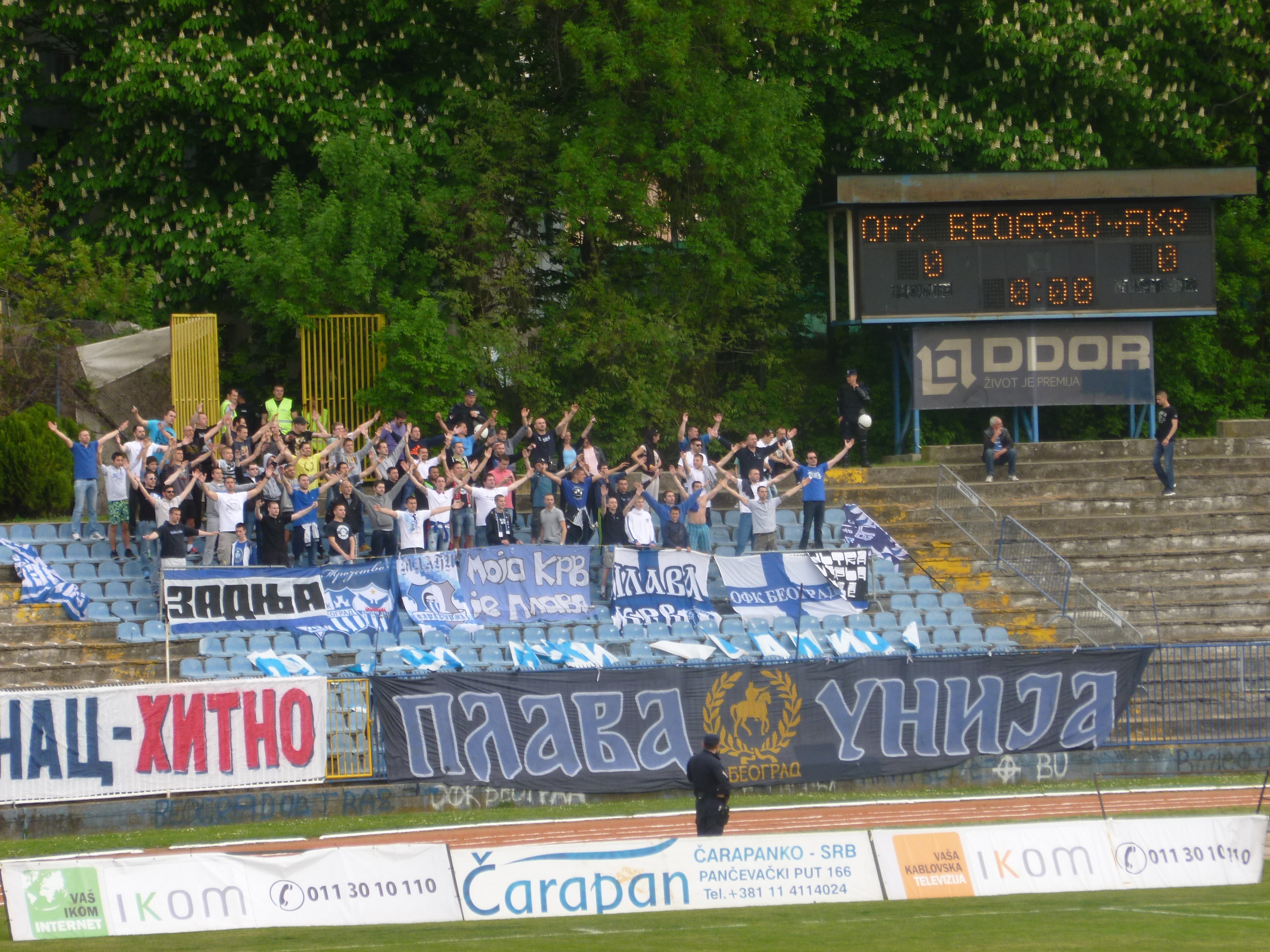 OFK’s average home gate tends to be around the 300 mark, and despite the swell in numbers for the Eternal Derby ‘after party’, it was never going to be an occasion that made the hairs on the back of your neck stand up. There was plenty of that, and then some the night before. But for the many football tourists that had descended on the Omlandinski, it was great just to enjoy a chilled out afternoon in the 28C sunshine, watch a spot of football, enjoy a few more ridiculously cheap beers, and reminisce on the scenes from the evening before. For the 80 or so OFK ‘Blue Union’ ultras and the 100 odd Rad ‘United Force’ ultras this was the only derby that mattered though. Despite being low in number, both sets of ultras added a welcome back drop of noise and colour to the massively empty ground (see below).