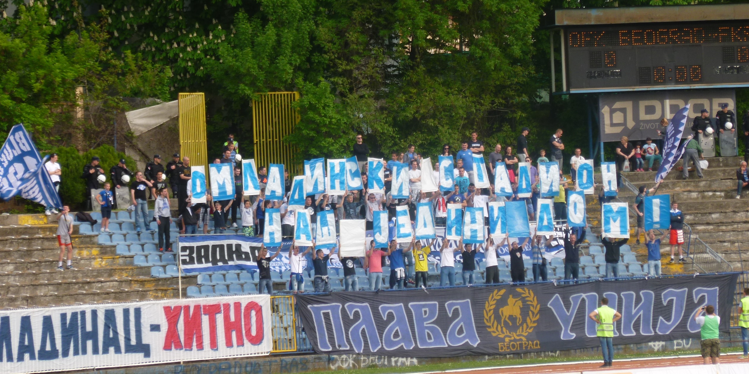 Like the Omlandinski, the game was low on quality, and was only made more interesting by the two small sets of ultras located at each end. Rad’s non-stop chanting and flag waving to a well-coordinated backdrop of rhythmic drum beating provided a rather samba feel in the warm afternoon sunshine. The Blue Union ultras unveiled a low budget tifo mid-way through the first half (see below), and top marks for making the effort lads! A 20th minute penalty dispatched by Jovanovic was the highlight of a drab first half. The highlight of the second half came as about 30 of the ‘Blue Union’s’ finest sprinted across a wide open empty terrace to berate a lone riot police officer through an iron fence! It was difficult to fathom what caused the upset – but maybe there was some disgruntlement at the state of the toilet facilities at half time!